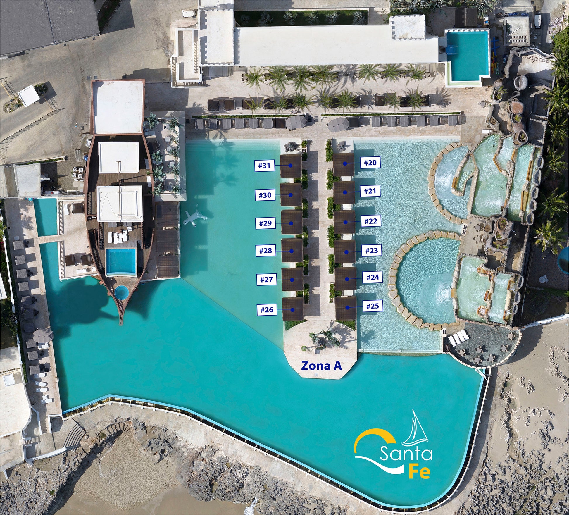 ¡Descubra la exclusiva Zona A en el Centro Recreativo Santa Fe! Este lugar privilegiado le ofrece una experiencia única junto a nuestras hermosas piscinas y con vistas al mar.